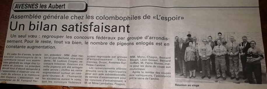 La société d'émulation du sport colombophile « l'Espoir » a de très anciennes origines. Le droit de chasse des pigeons n'étant pas uniquement réservé au seigneur, les habitants avaient la possibilité d'élever leurs pigeons. À Avesnes-les-Aubert, on dénombrait à une époque 19 colombiers dont 7 aussi haut que des clochers abritant chacun environ 1500 couples et 12 autres plus petits contenant 20 à 50 couples soit au total 25 000 pigeons. Ces colombiers se trouvaient généralement au dessus des portes charretières des fermes comme l'ancienne ferme Malaquin rue Paul Vaillant Couturier ou de la rue de Cambrai. Par la suite le terme de Coulonneux s'appliqua à tous les éleveurs de pigeons d'origine souvent modeste exerçant une activité ouvrière dans le textile ou la métallurgie.