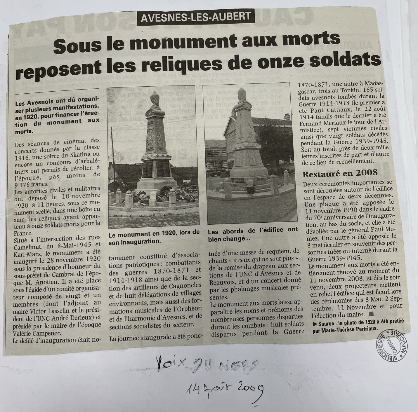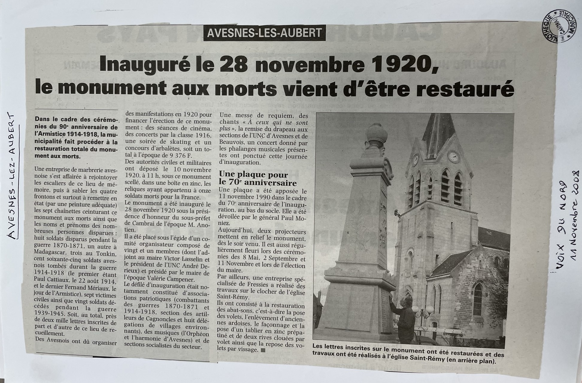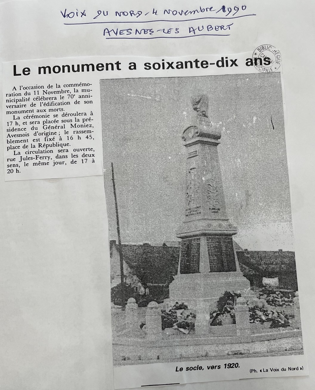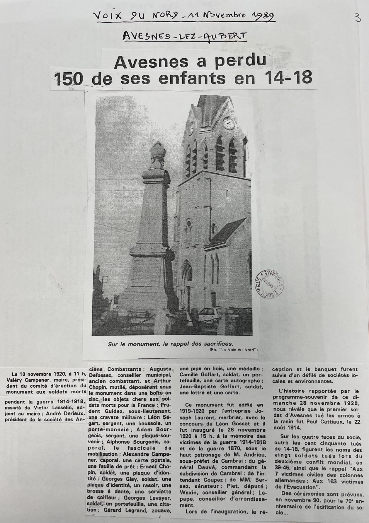 Le monument aux morts a été construit en 1920 aprÚs la fin de la PremiÚre guerre mondiale qui a emporté 155 soldats avesnois et de nombreux civils. Lors de son inauguration, sous celui-ci, les reliques de 11 soldats morts pour la France sont déposées dans une boite en zinc. Sur les quatre faces du monument, figurent les noms et prénoms des 155 soldats avesnois tombés lors de la guerre 1914-1918 et de 20 soldats lors du conflit de 1939-1945. Une nouvelle plaque en mémoire aux victimes déportées, internées, fusillées pendant la DeuxiÚme guerre mondiale est apposée en 2009, pour la commémoration du 8 Mai. Sur le mur extérieur de l'église figurent les noms des 8 soldats avesnois tués lors de la guerre de 1870/1871. Tout prÚs, une stÚle est dédiée à la mémoire des anciens combattants d'Afrique du Nord, Algérie, Tunisie et Maroc.
