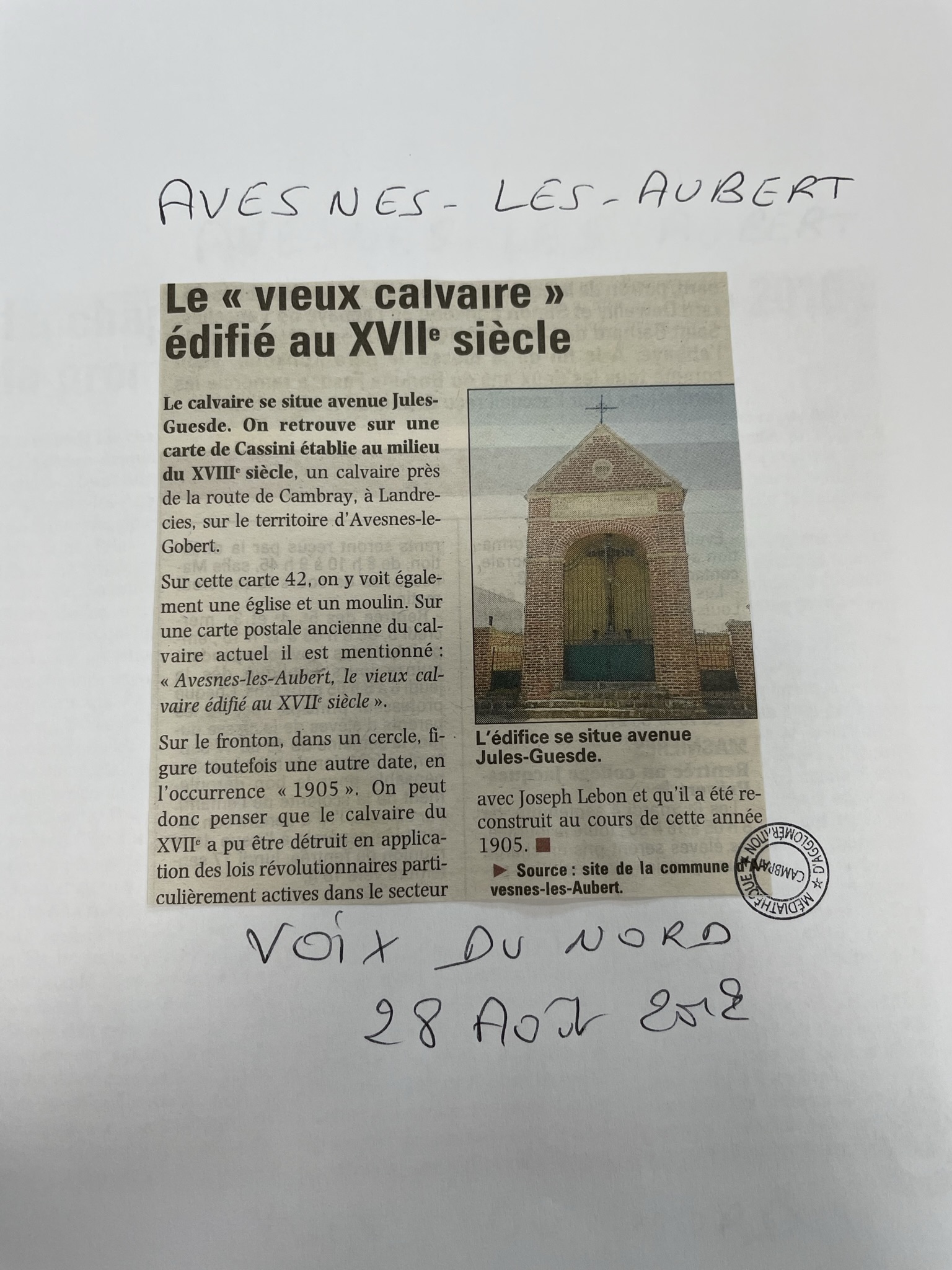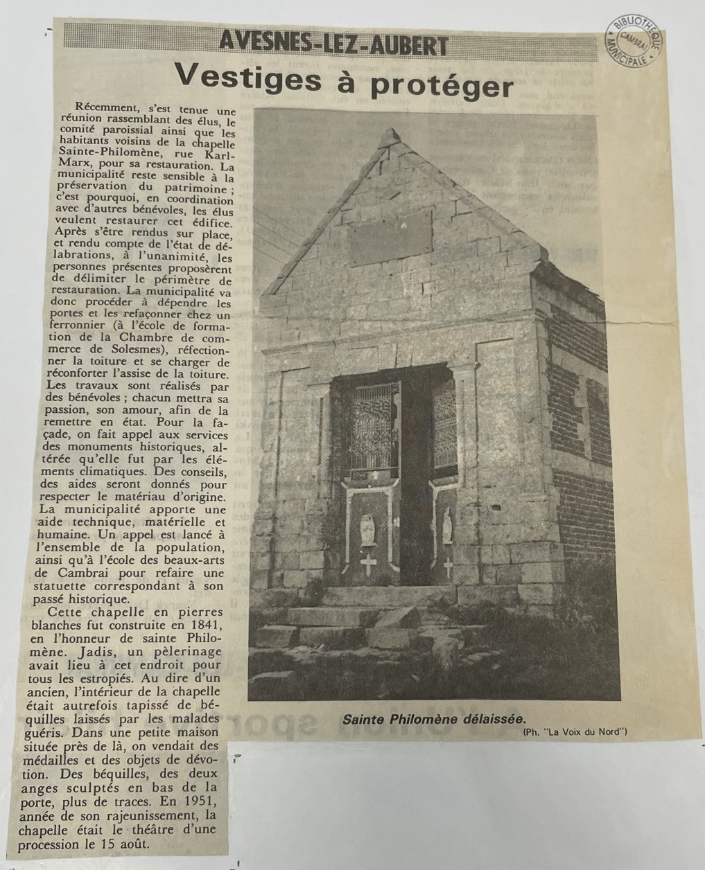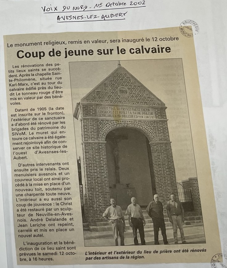 - Gustave PEZIN, « Avesnes-Les-Aubert : restauration de la chapelle Sainte-Philomène », Jadis en Cambrésis, n°53, septembre 1992.