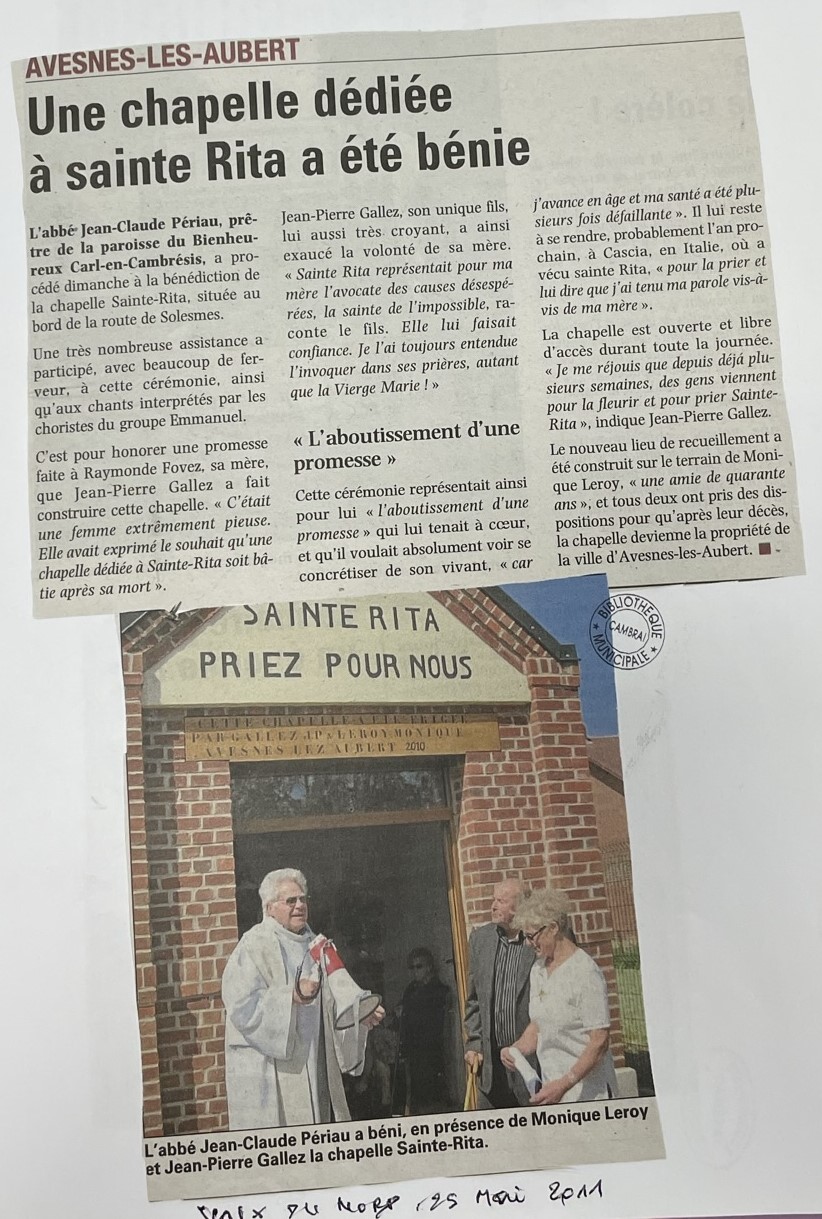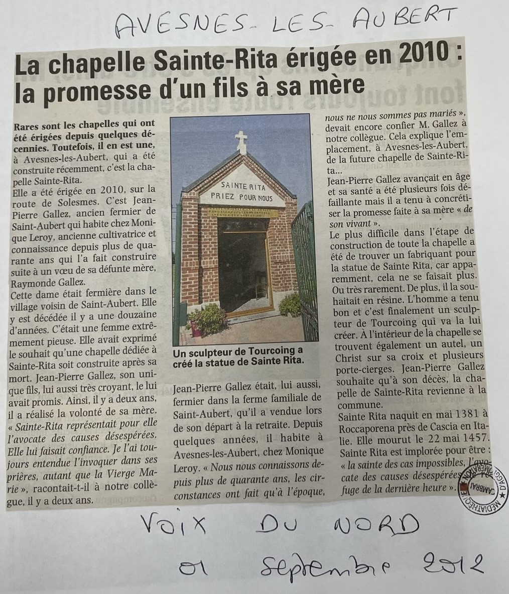 Sainte Rita est implorée pour être la sainte des cas impossibles, l'avocate des causes désespérées, le refuge de la dernière heure. Cette chapelle est érigée en 2010, sur la route de Solesmes, à la demande de Jean Pierre Gallez, ancien fermier de Saint Aubert, à la suite d’un vœux de sa défunte mère.