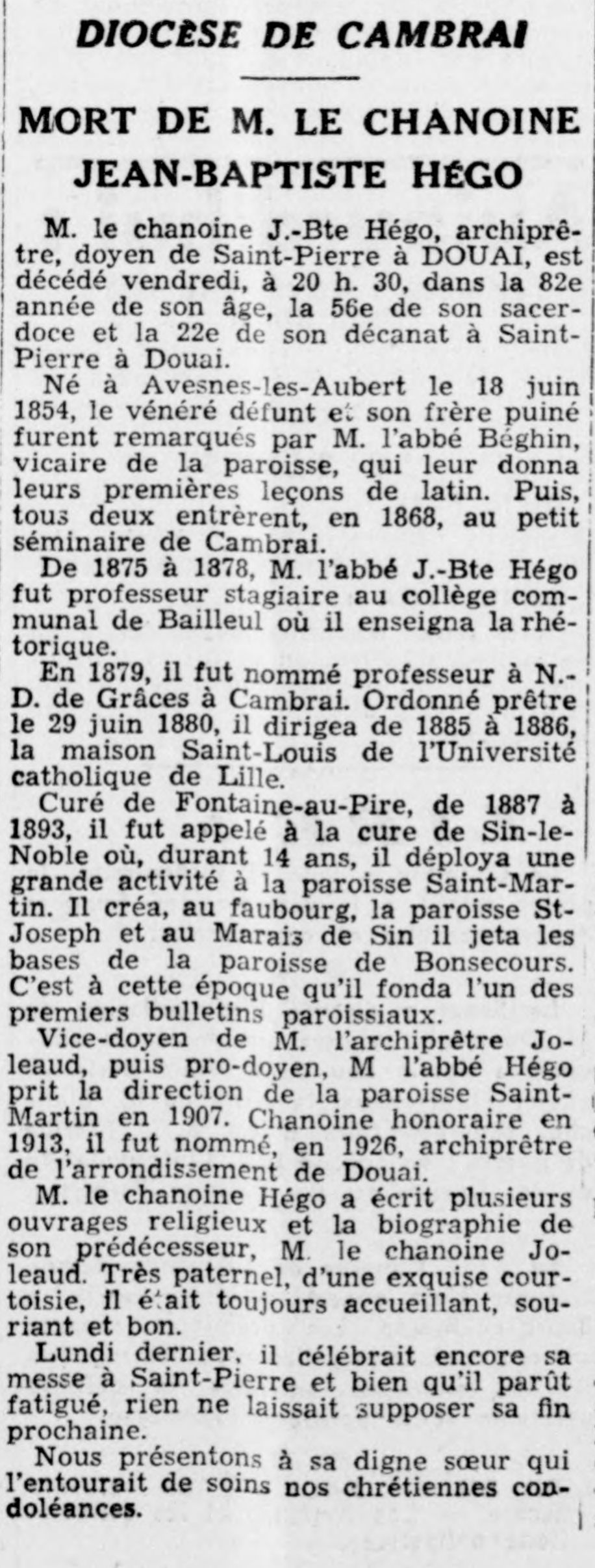 Jean-Baptiste Hégo 1854-1936Mort du chanoine Jean-Baptiste Hégo 07/11/1936Funérailles du chanoine Hégo 08/11/1936L'abbé Marose 22/03/1949