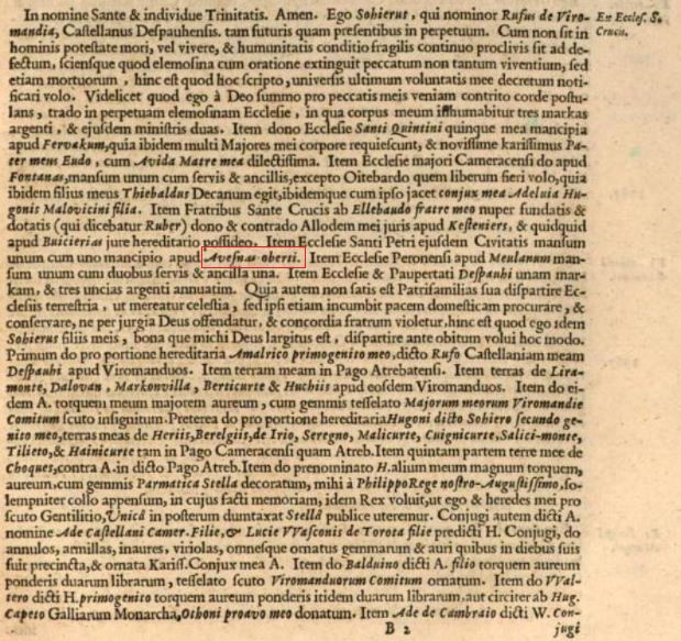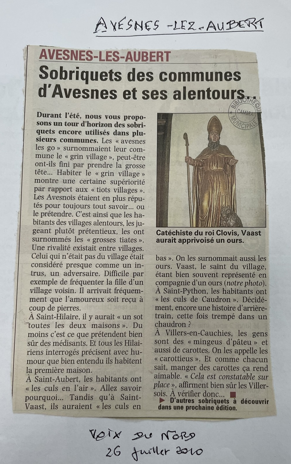 « De gueules à trois lions d'argent couronnés d'or » tels sont les armes de la commune d'Avesnes-les-Aubert. Ces armoiries sont issus de l'appartenance de la commune aux seigneurs d'Ésclaibes. En 1429, un certain Jean d'Avesnes meurt célibaire léguant ses biens à sa soeur aînée, Jeanne d'Avesnes. En 1906, cette Jeanne avait épousé Jean d'Ésclaibes, petit fils de Gérard d'Ésclaibes, grand bailli du Hainaut en 1364 ; c'est ainsi que la seigneurie de Clairmont et de Prayelle et son fief adjacent d'Avesnes-les-Aubert et de Boussières s'unirent à la seigneurie de Peruwelz-lez-Busigny, de Helgies et du fief du château de Solesmes de la maison d'Ésclaibes (d'où la présence de trois lions). Les bien que possédait Jeanne d'Avesnes sur le terroir d'Avesnes-les-Aubert comprennaient une tour, masure, courtil, jardin en 98 mencaudées de terre labourable, un moulin à vent et en cinq hommages dépendant du fief. Jeanne mourut en 1465 et fut enterrée dans l'église d'Avesnes-les-Aubert. Sa tombe de marbre située côté droit du grand autel se voyait encore avec ces mots : « cy gist demoiselle Jeanne, Dame Davesnes ».