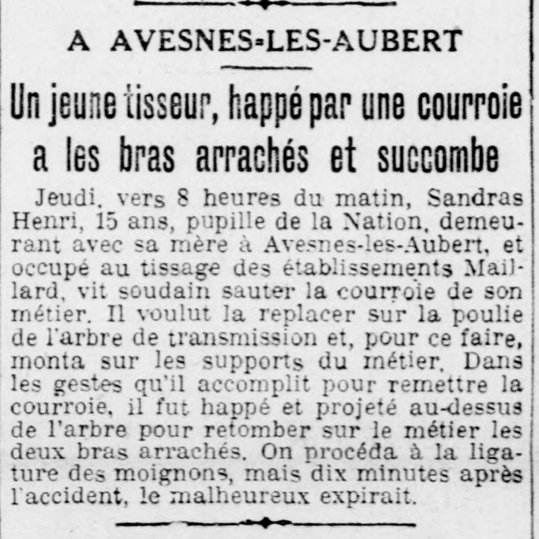 Un jeune tisseur happé par une courroie a les bras arrachés et succombe
