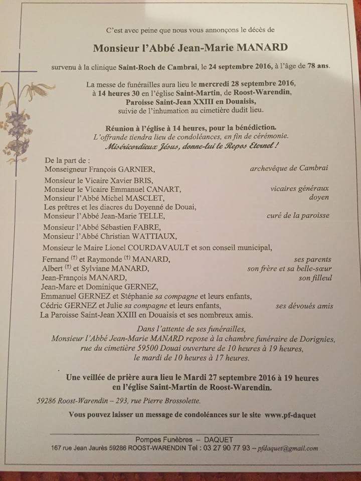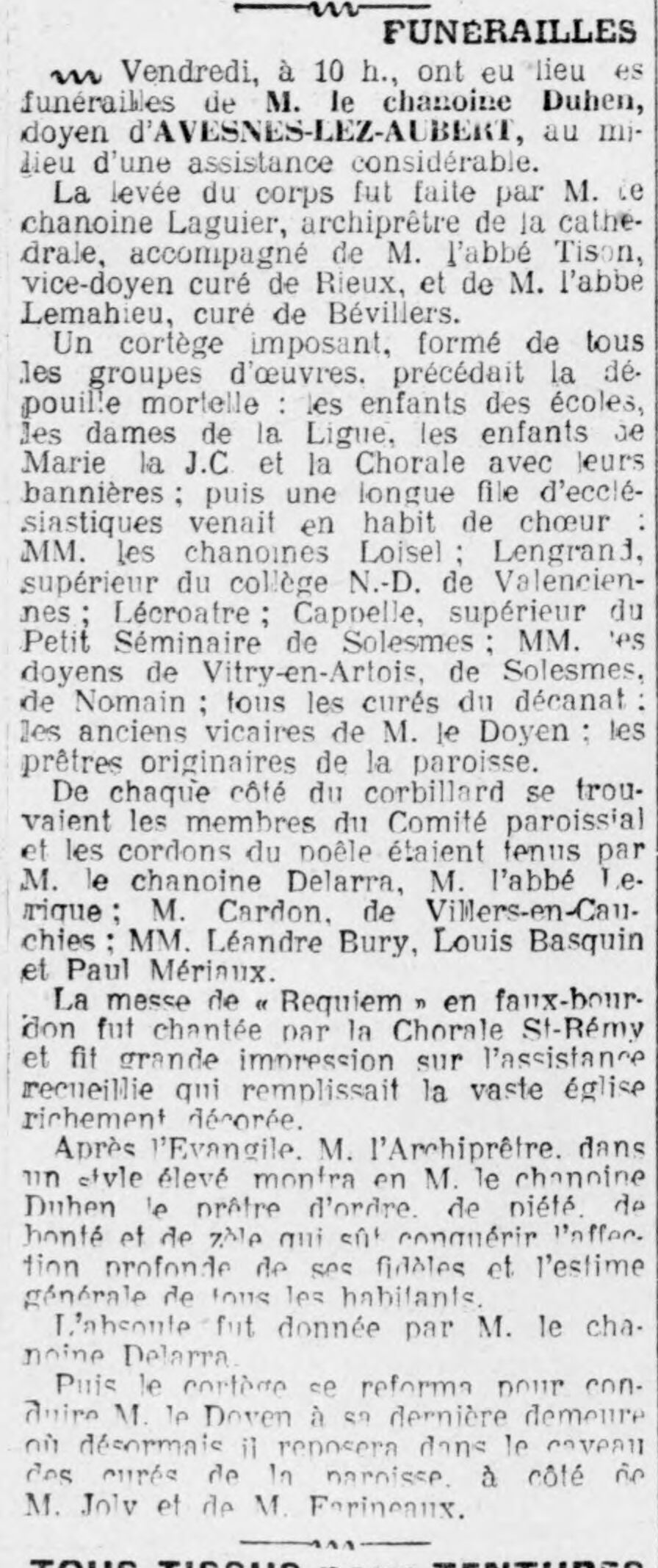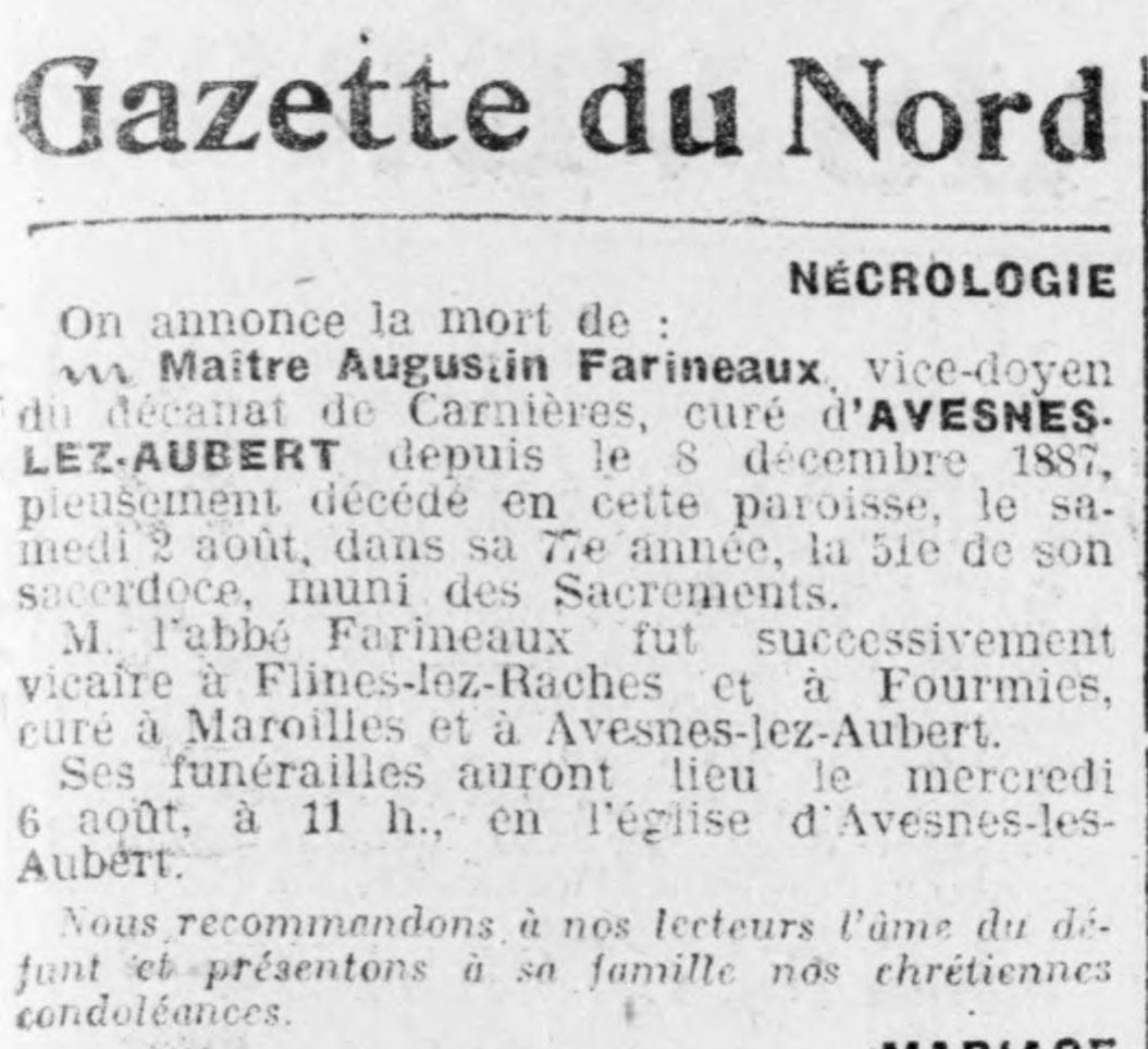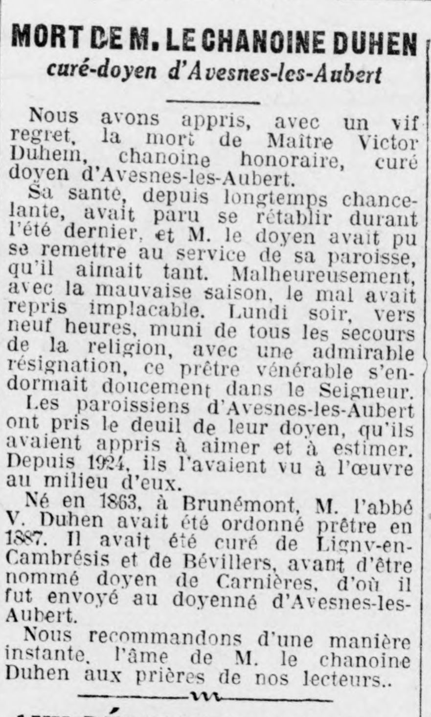 Liste des prêtres Martin Brudart curé de céent 1543Funérailles de l'abbé Augustin Farineaux 05/08/1924Funérailles de l'abbé Augustin Farineaux 09/08/1924Mort du chanoine Duhen curé-doyen d'Avesnes-les-Aubert 12/12/1933La mort de M. le chanoine Duhen 14/12/1933Funérailles du chanoine Victor Duhen 17/12/1933Décès du curé-doyen Jules Delporte 31/04/1937Nomination Adolphe Jombart 18/04/1937Abel Pruvot Installation de l'abbé Verfaillie 14/07/1962Décès de l'abbée Jean-Marie Manard 2016Jean-Marie Manard