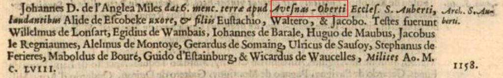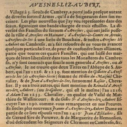 « De gueules à trois lions d'argent couronnés d'or » tels sont les armes de la commune d'Avesnes-les-Aubert. Ces armoiries sont issus de l'appartenance de la commune aux seigneurs d'Ésclaibes. En 1429, un certain Jean d'Avesnes meurt célibaire léguant ses biens à sa soeur aînée, Jeanne d'Avesnes. En 1906, cette Jeanne avait épousé Jean d'Ésclaibes, petit fils de Gérard d'Ésclaibes, grand bailli du Hainaut en 1364 ; c'est ainsi que la seigneurie de Clairmont et de Prayelle et son fief adjacent d'Avesnes-les-Aubert et de Boussières s'unirent à la seigneurie de Peruwelz-lez-Busigny, de Helgies et du fief du château de Solesmes de la maison d'Ésclaibes (d'où la présence de trois lions). Les bien que possédait Jeanne d'Avesnes sur le terroir d'Avesnes-les-Aubert comprennaient une tour, masure, courtil, jardin en 98 mencaudées de terre labourable, un moulin à vent et en cinq hommages dépendant du fief. Jeanne mourut en 1465 et fut enterrée dans l'église d'Avesnes-les-Aubert. Sa tombe de marbre située côté droit du grand autel se voyait encore avec ces mots : « cy gist demoiselle Jeanne, Dame Davesnes ».